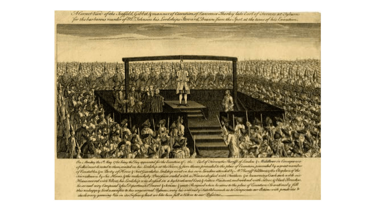 This was the last occasion when a peer of the realm was hanged for murder, but it was also the first time that a new device was used at the gallows. In the past, those convicted were turned off a cart or ladder; Ferrers was the ‘guinea pig’ for the ‘new drop’, whereby the floor was removed from underneath his feet.