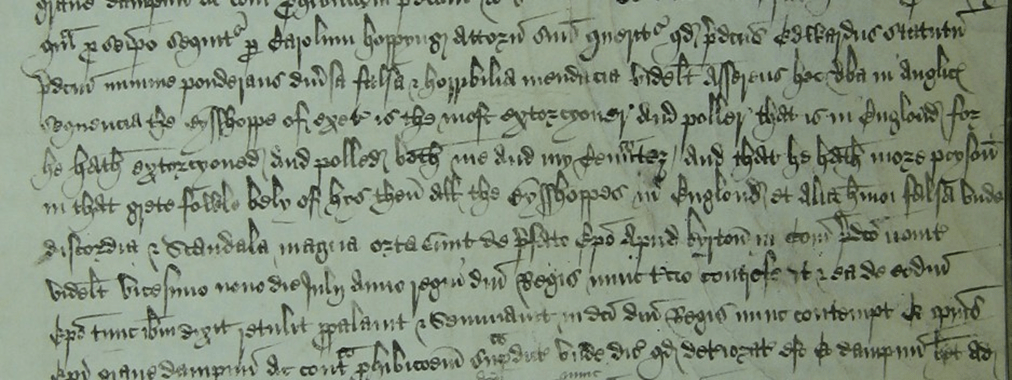 Hugh Oldham (c.1450-1519), bishop of Exeter from 1505, has had a good press from historians. Described by the Exeter MP and chronicler, John Hooker alias Vowell (d. 1601), ‘as a great favourer and a friend both to learning and to learned men’, he was a major benefactor of Corpus Christi College, Oxford, the foundation of his friend, Richard Foxe, bishop of Winchester. Although Hooker was no advocate of Oldham’s own academic attainments, rather patronisingly remarking that he had ‘more zeal than knowledge and more devotion than learning’, he praised him for his friendliness. A curious action in the court of King’s bench in 1512 gives a rather contrasting picture of the bishop, albeit one, as an ex parte statement, on which little reliance is to be placed. When the bishop’s servant, William Knot, came to Crediton to summon one of the clerks of the diocese, Edward Grigson, to appear in the consistory court, Grigson responded uncharitably, claiming that ‘the Bysshoppe of exet[er] is the most extorcyoner and poller that is in Englond for he hath extorcyoner and polled both me and my Tenauntez and that he hath more poison in that grete fowle bely of hys then all the Bysshoppes in Englond’. A jury found for the bishop, and he was awarded the relatively modest sum of £8 in costs and damages.