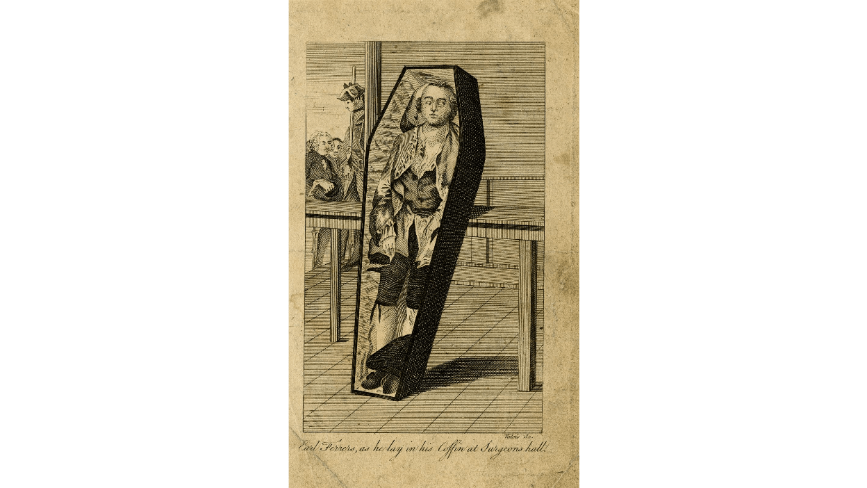 At the close of the trial each lord, from the most junior to the most senior, stood in turn to declare whether or not they believed Ferrers to be guilty or not guilty ‘upon mine honour’. The result was never in much doubt and on 17 April one by one Ferrers’ erstwhile colleagues rose to condemn him. On the 18th the court reconvened when he was sentenced to be hanged and his body submitted for dissection in Surgeons’ Hall.
