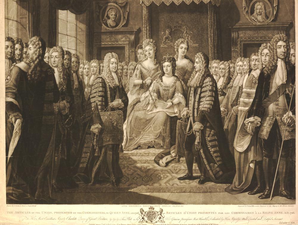 The finalized ‘Articles of Union’ were signed at Whitehall on 22 July 1706 and formally presented to Queen Anne the following day. They were considered by the Scottish Parliament during October 1706-January 1707, and an Act was then passed declaring Scotland’s assent. The Articles were then debated at Westminster, first by the Commons, then the Lords, during February 1707. A bill was passed for ratifying the Articles to which the Queen gave her assent in person at the House of Lords on 6 March.